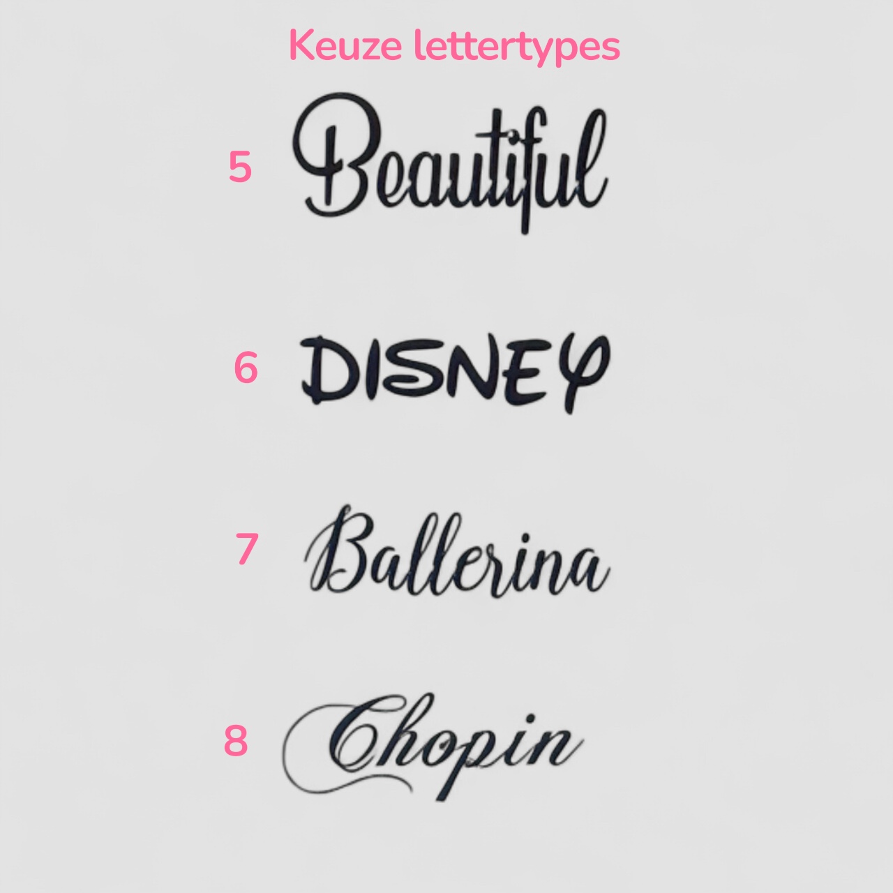 De keuze van het lettertype en de kleur voor de bedrukking kunnen jullie doorgeven bij het afrekenen van je bestelling bij opmerkingen.